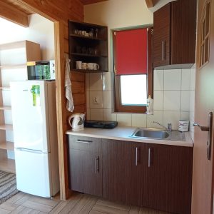 Na wyposażeniu kuchni znajdują się: pełnowymiarowa lodówka z zamrażalnikiem, kuchenka elektryczna, mikrofalówka, czajnik oraz podstawowa zastawa, dzięki czemu można samodzielnie przygotować sobie posiłki.