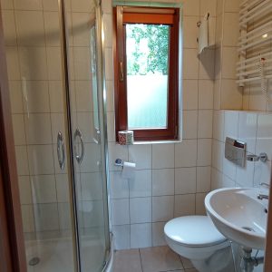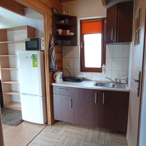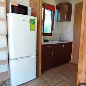 Na wyposażeniu kuchni znajdują się: pełnowymiarowa lodówka z zamrażalnikiem, kuchenka elektryczna, czajnik oraz podstawowa zastawa, dzięki czemu można samodzielnie przygotować sobie posiłki.