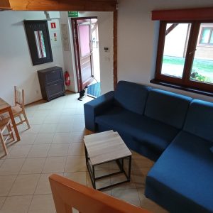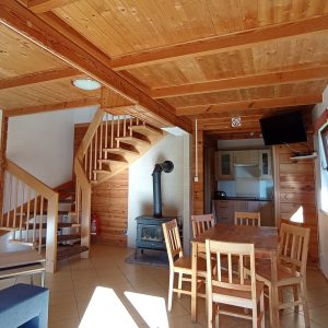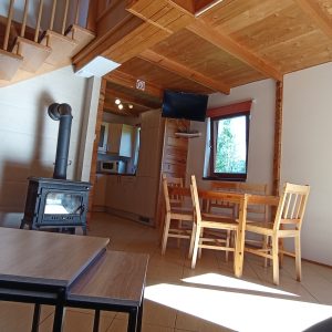 Dodatkowo w salonie jest telewizor oraz wolnostojący kominek, opalany drewnem. W sezonie zimowym do dyspozycji są także grzejniki elektryczne.