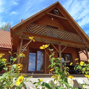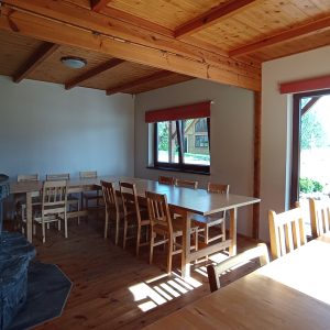 W każdym z pokoi znajduje się telewizor, a w jadalni dodatkowo wieża z głośnikami. W kuchni do dyspozycji jest piekarnik, płyta indukcyjna, pełnowymiarowa lodówka z zamrażalnikiem, czajnik oraz podstawowa zastawa do samodzielnego przygotowania posiłków. W jadalni znajdują się trzy duże, rozkładane stoły przy których swobodnie usiąść może 12 osób (po rozłożeniu do ~25 osób). Również tutaj znajdziecie piękny, zabudowany kamieniem kominek, który nada klimat każdemu spotkaniu. A dodatkowe wyjście na taras może szybko przenieść spotkanie na świeże powietrze.