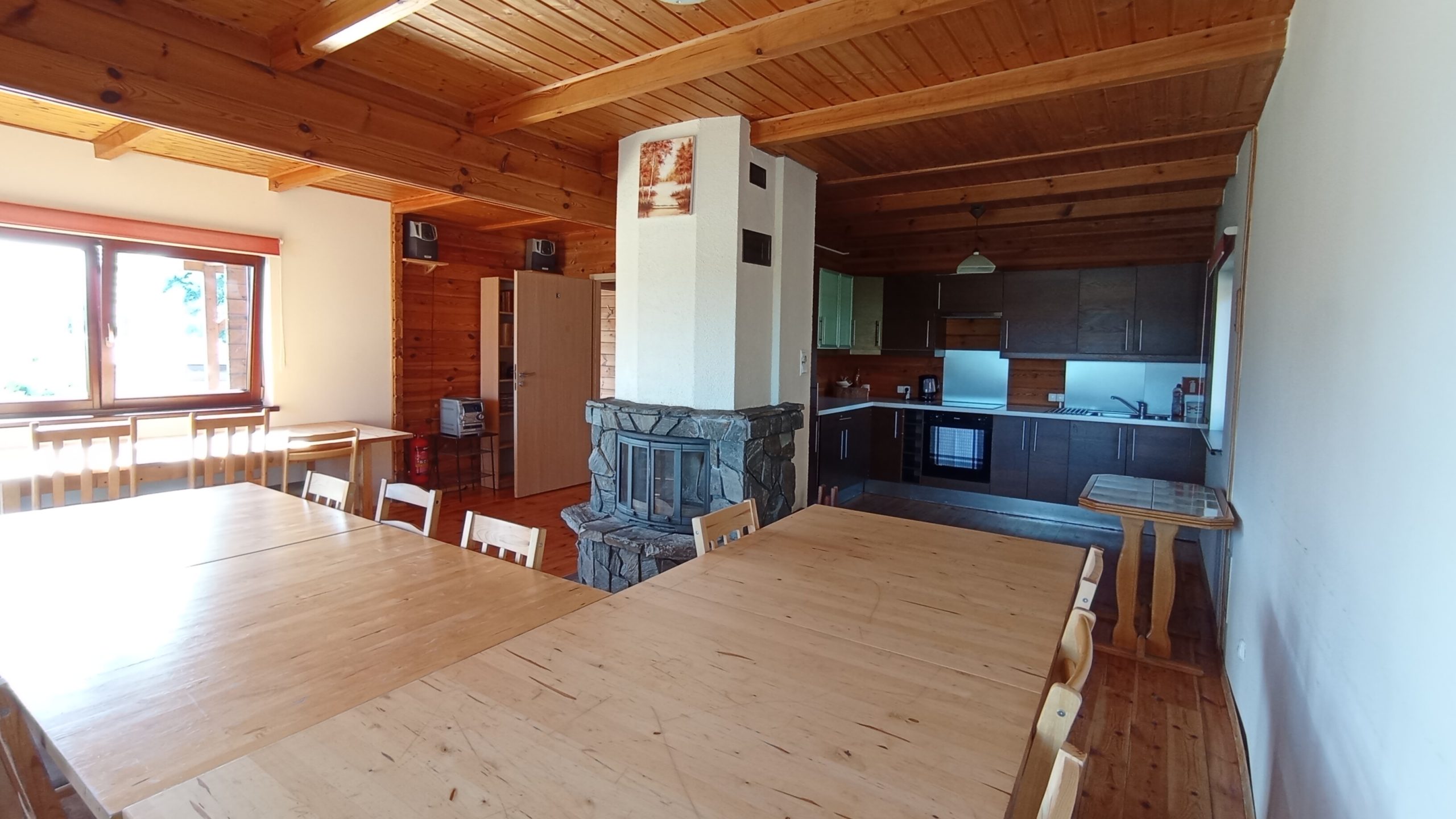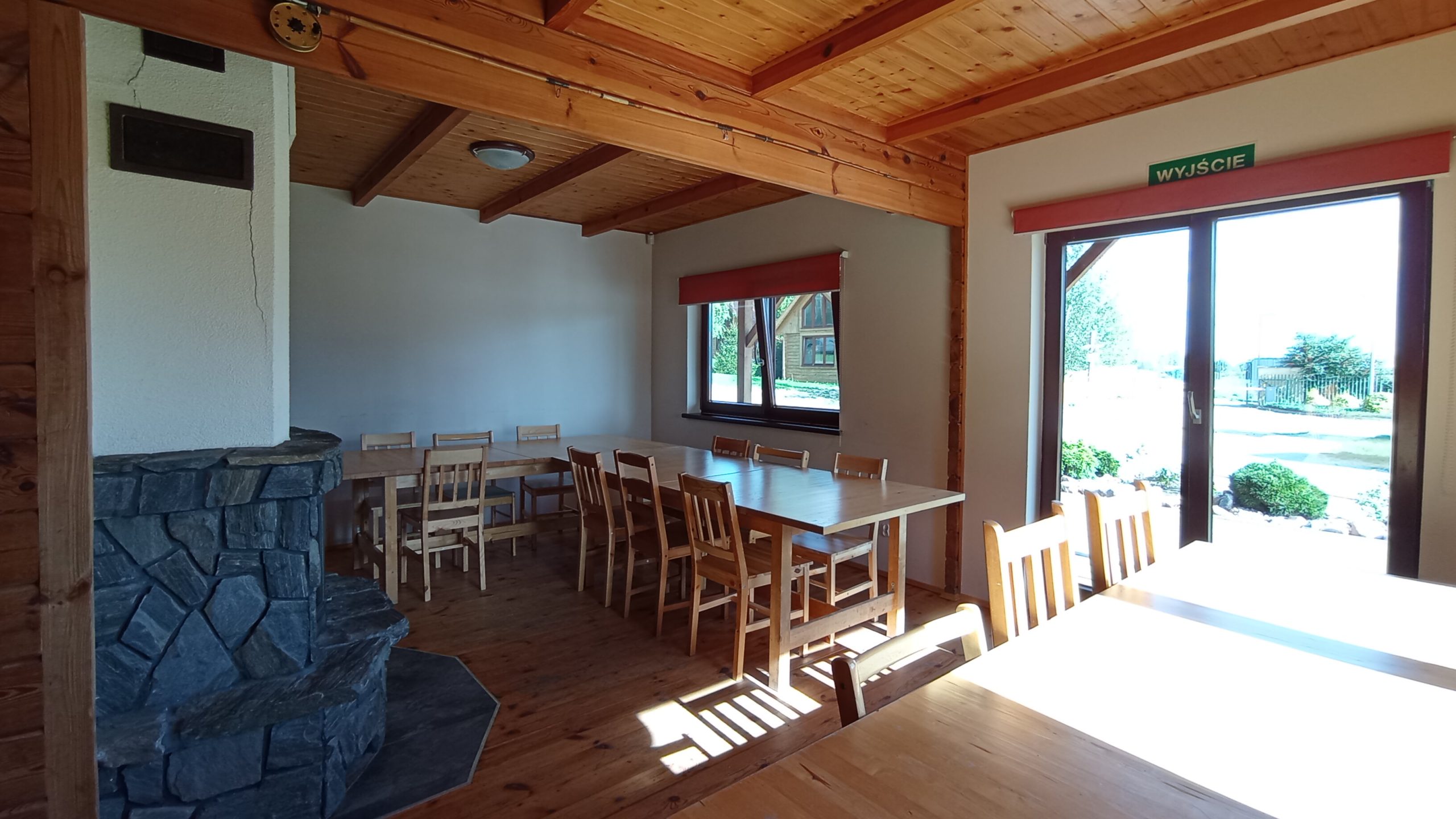 W każdym z pokoi znajduje się telewizor, a w jadalni dodatkowo wieża z głośnikami. W kuchni do dyspozycji jest piekarnik, płyta indukcyjna, pełnowymiarowa lodówka z zamrażalnikiem, czajnik oraz podstawowa zastawa do samodzielnego przygotowania posiłków. W jadalni znajdują się trzy duże, rozkładane stoły przy których swobodnie usiąść może 12 osób (po rozłożeniu do ~25 osób). Również tutaj znajdziecie piękny, zabudowany kamieniem kominek, który nada klimat każdemu spotkaniu. A dodatkowe wyjście na taras może szybko przenieść spotkanie na świeże powietrze.